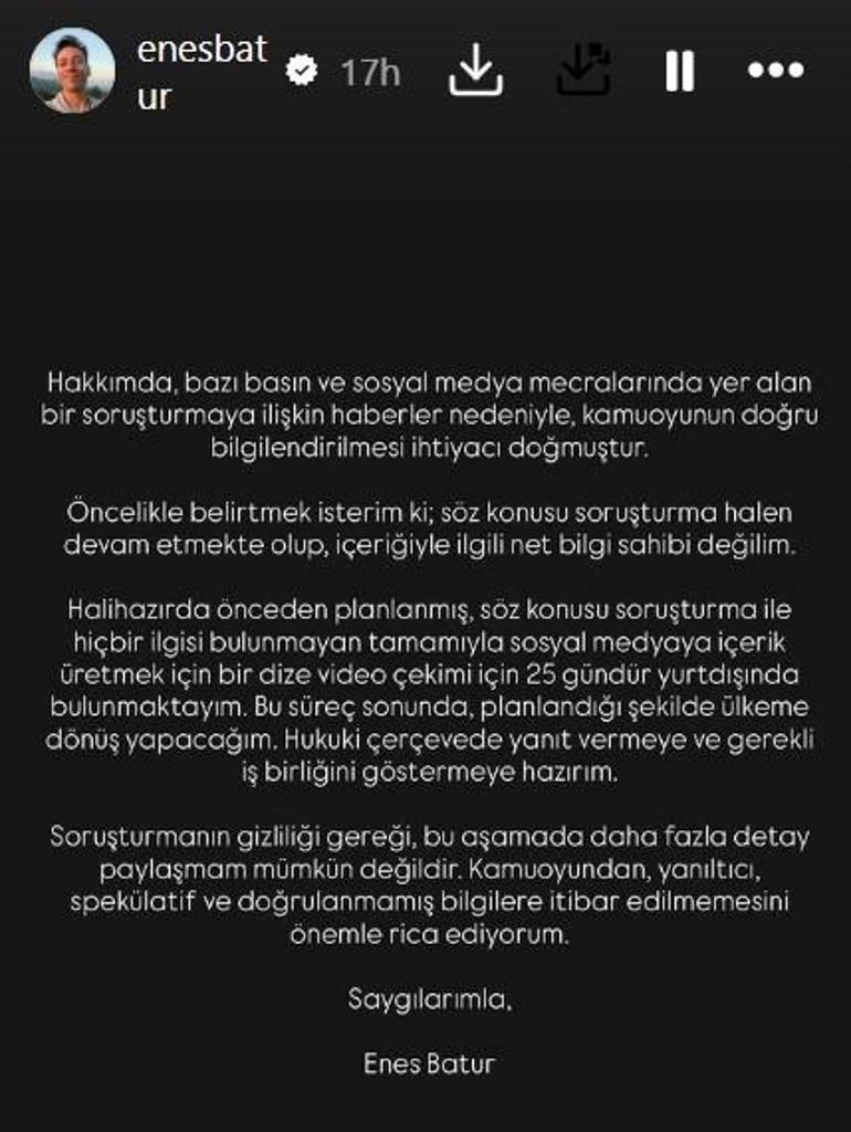 “Hakkımda, birtakım basın ve toplumsal medya mecralarında yer alan bir soruşturmaya ait haberler nedeniyle, kamuoyunun yanlışsız bilgilendirilmesi muhtaçlığı doğmuştur. Öncelikle belirtmek isterim ki; kelam konusu soruşturma hala devam etmekte olup, içeriğiyle ilgili net bilgi sahibi değilim. Halihazırda evvelce planlanmış, kelam konusu soruşturma ile hiçbir ilgisi bulunmayan büsbütün toplumsal medyaya içerik üretmek için bir dize görüntü çekimi için 25 gündür yurt dışında bulunmaktayım. Bu süreç sonunda, planlandığı formda ülkeme dönüş yapacağım. Tüzel çerçevede cevap vermeye ve gerekli iş birliğini göstermeye hazırım. Soruşturmanın saklılığı gereği, bu kademede daha fazla ayrıntı paylaşmam mümkün değildir. Kamuoyundan, aldatıcı, spekülatif ve doğrulanmamış bilgilere prestij edilmemesini ehemmiyetle rica ediyorum. Hürmetlerimle Enes Batur.”